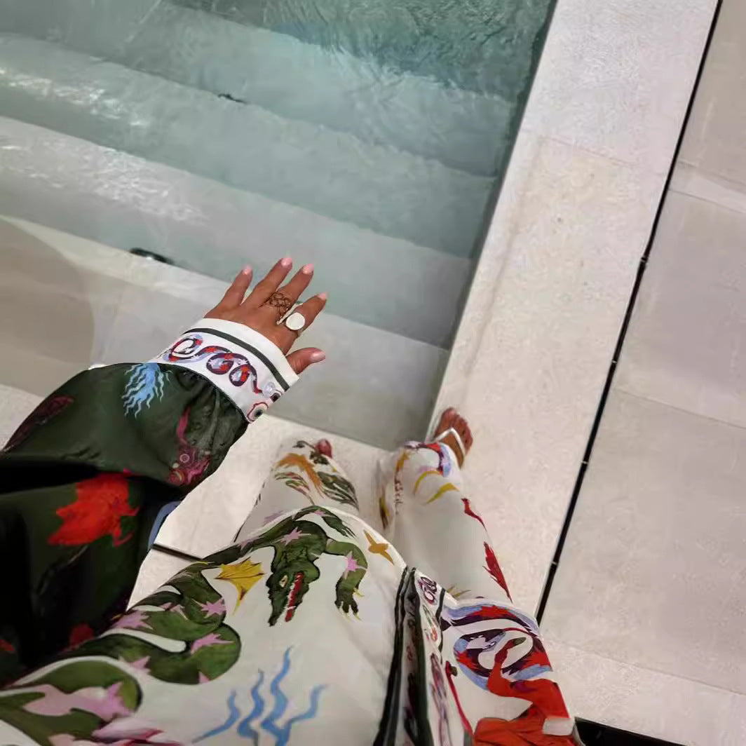 Elevate your style with the Celesta Luxe Lounge Set. This exquisite multi-piece ensemble includes a flowing top, wide-leg trousers all adorned with vibrant celestial and botanical prints. Designed for ultimate comfort and effortless elegance, this set is perfect for lounging in style or making a statement on a casual day out.